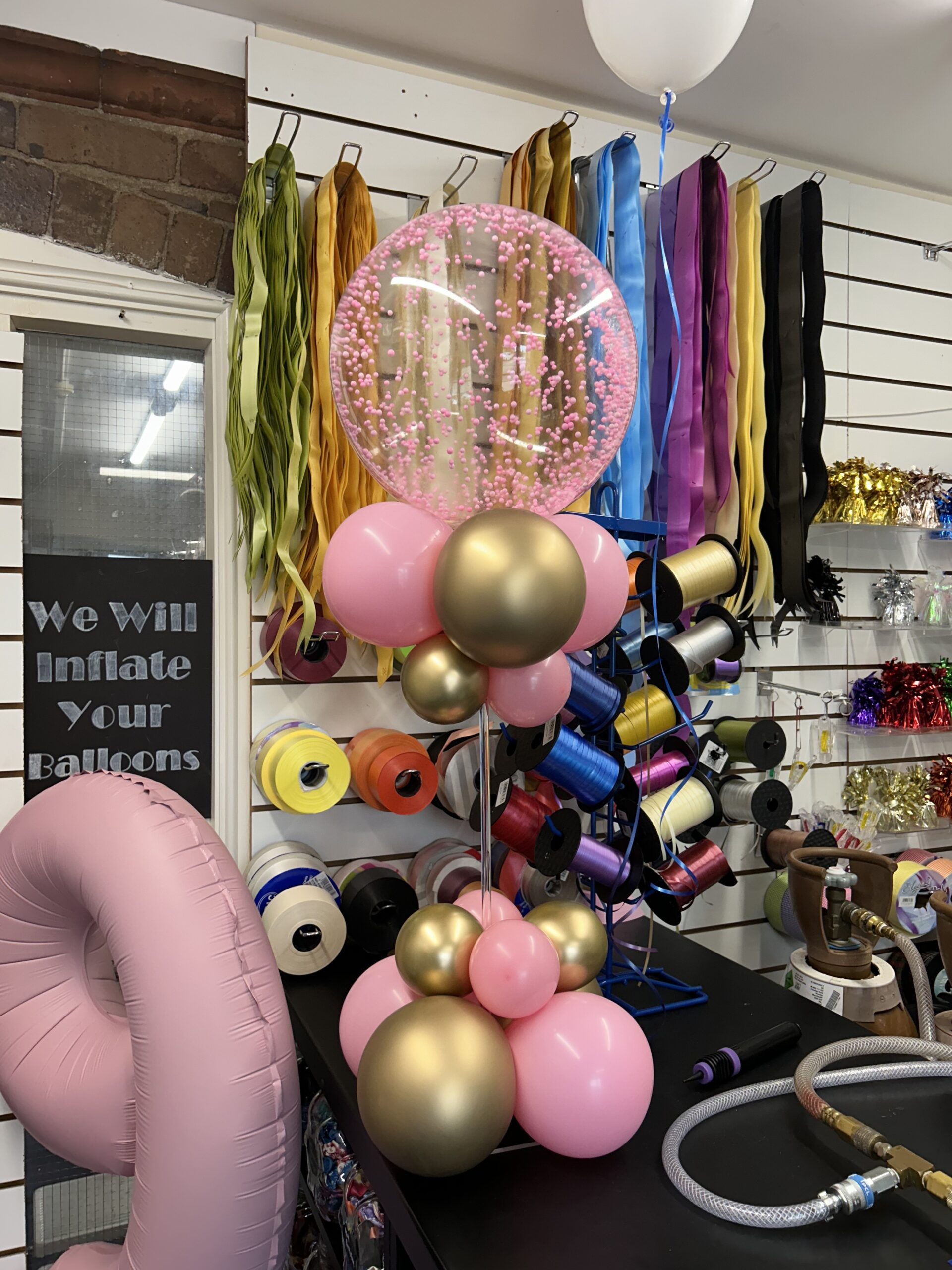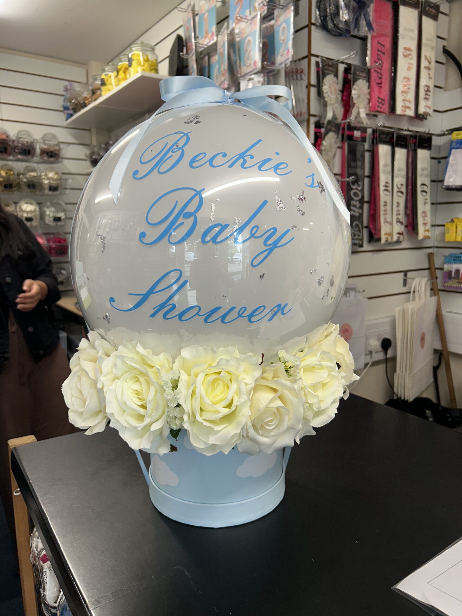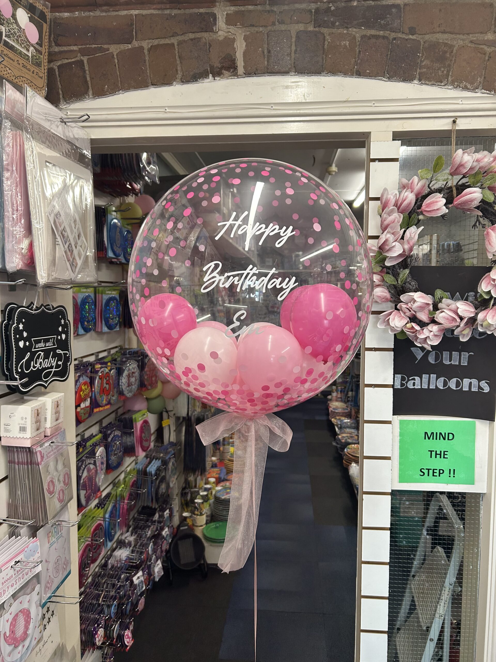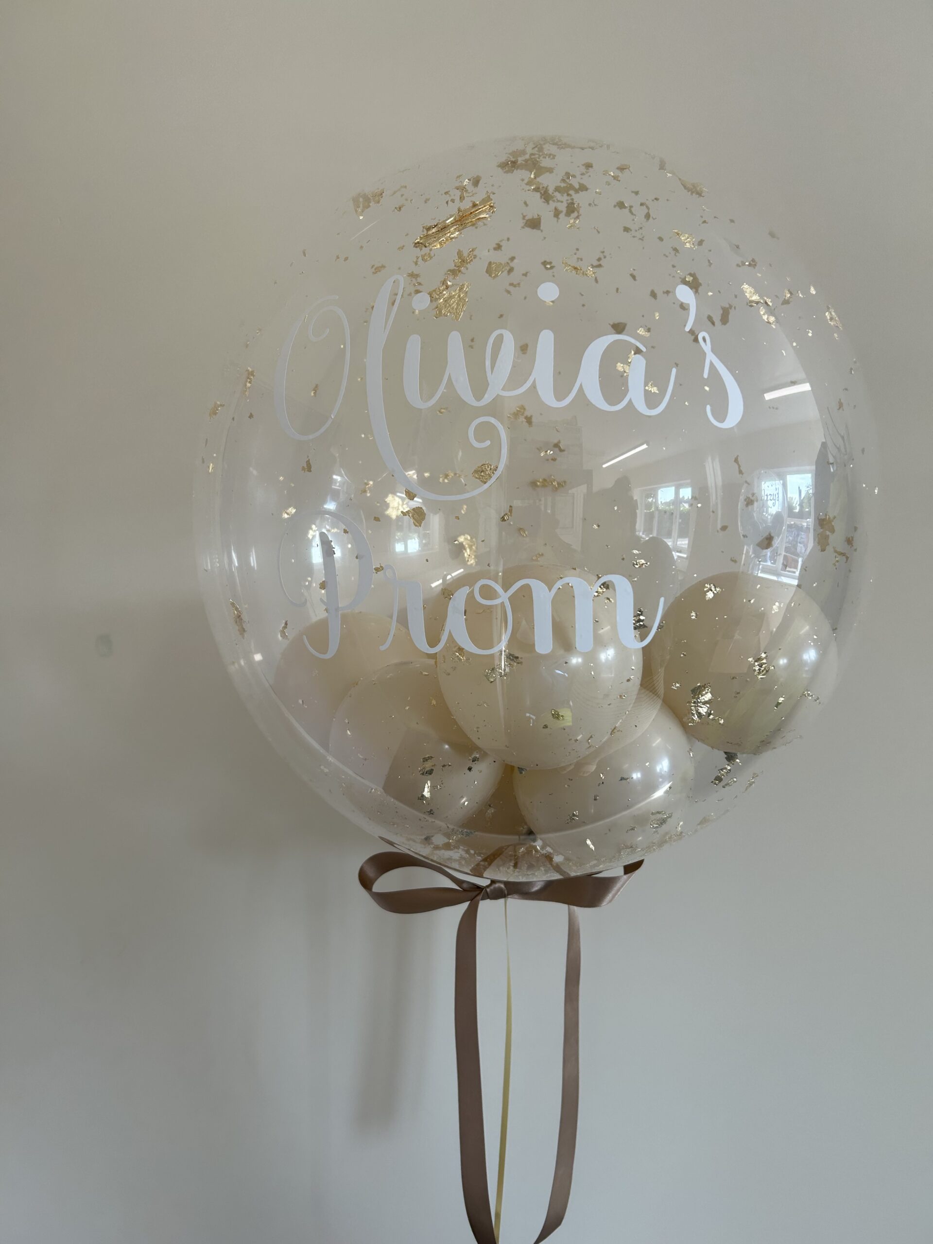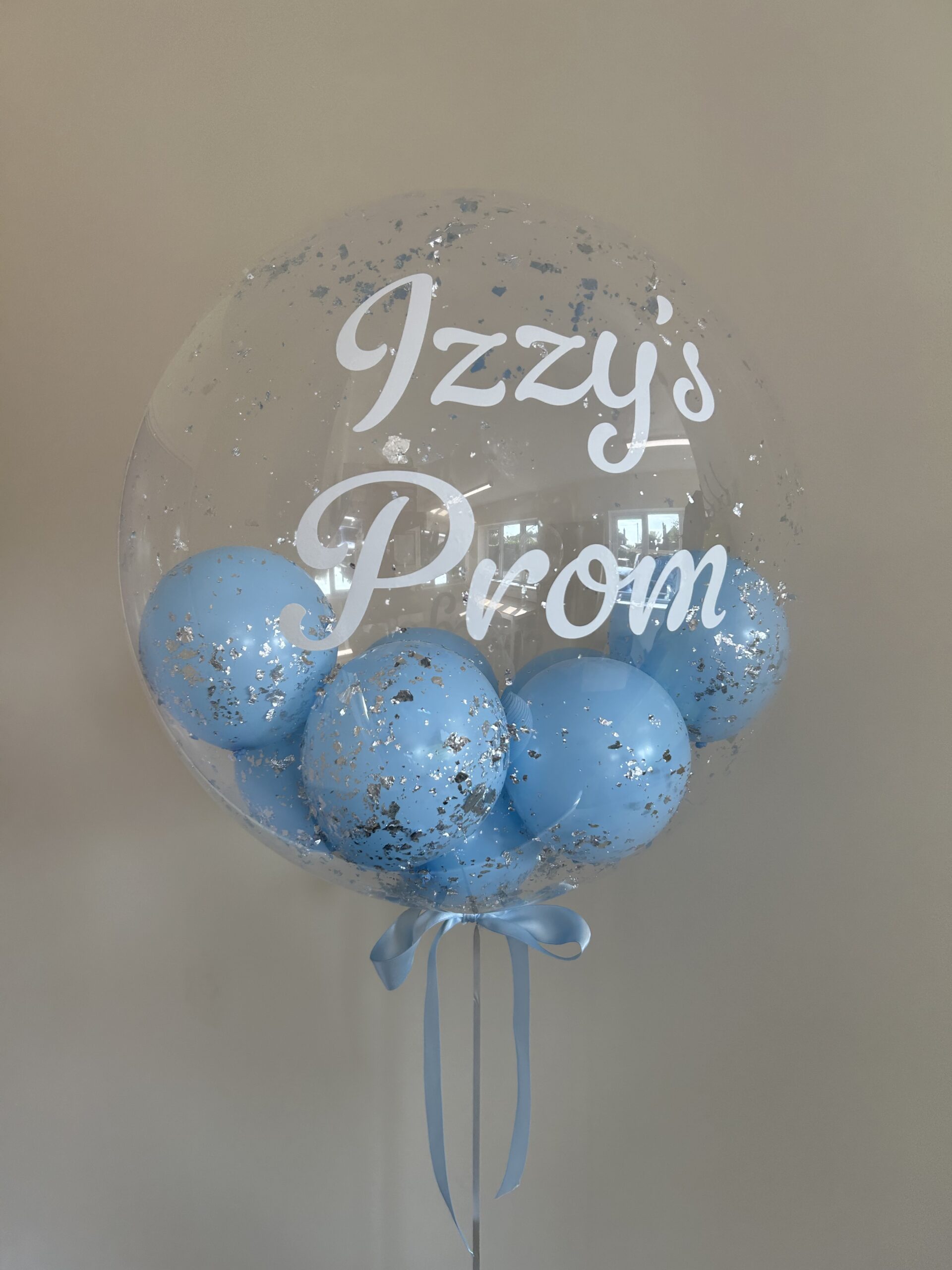 24” clear bubble balloon stuffed with 5” latex balloons in your choice of colour. Personalised with any message and comes with or without foil flecks (Silver/Gold/Rose Gold) and a bow in your colour choice. This is a helium balloon that includes the weight. Price £25.00