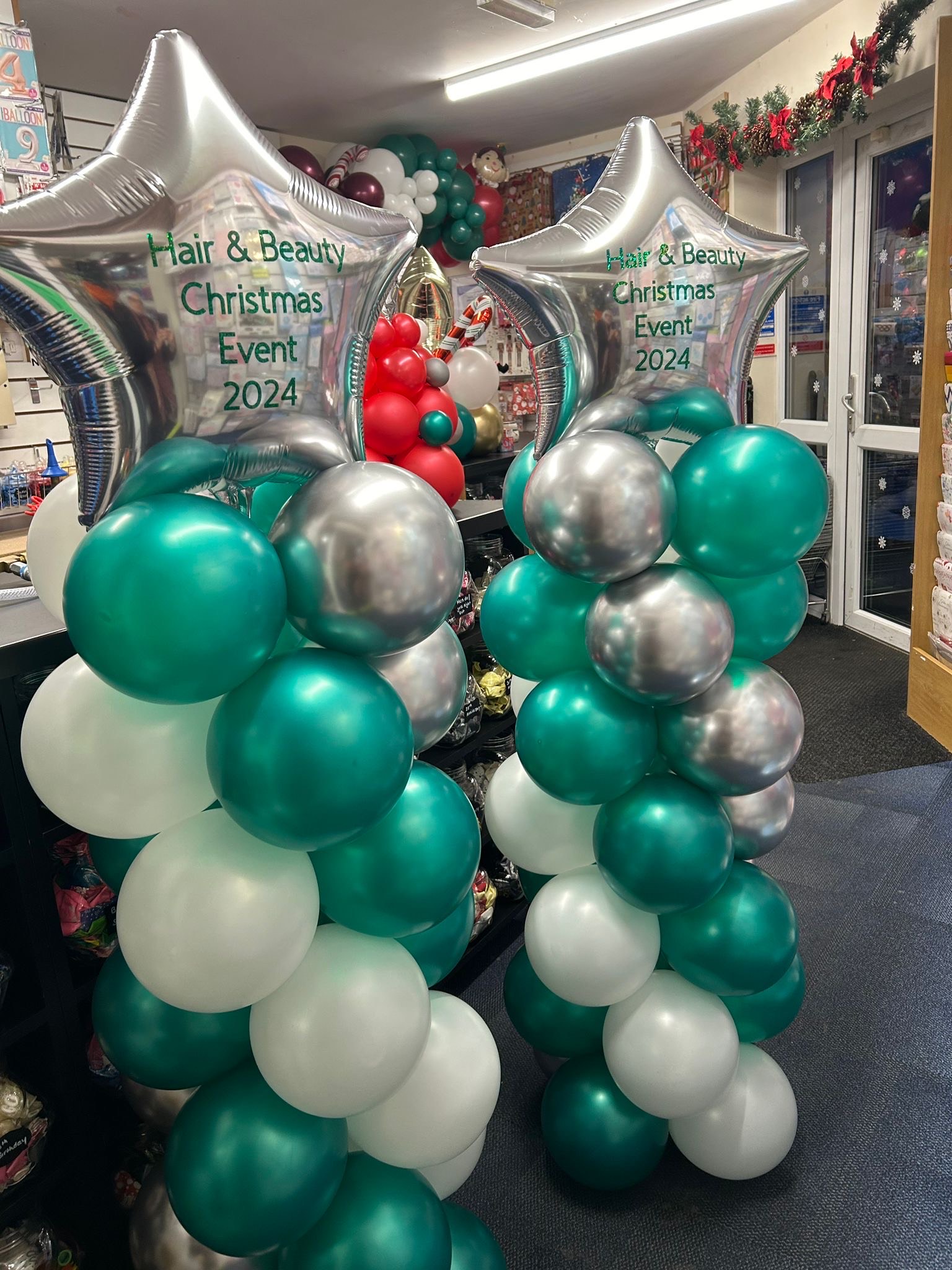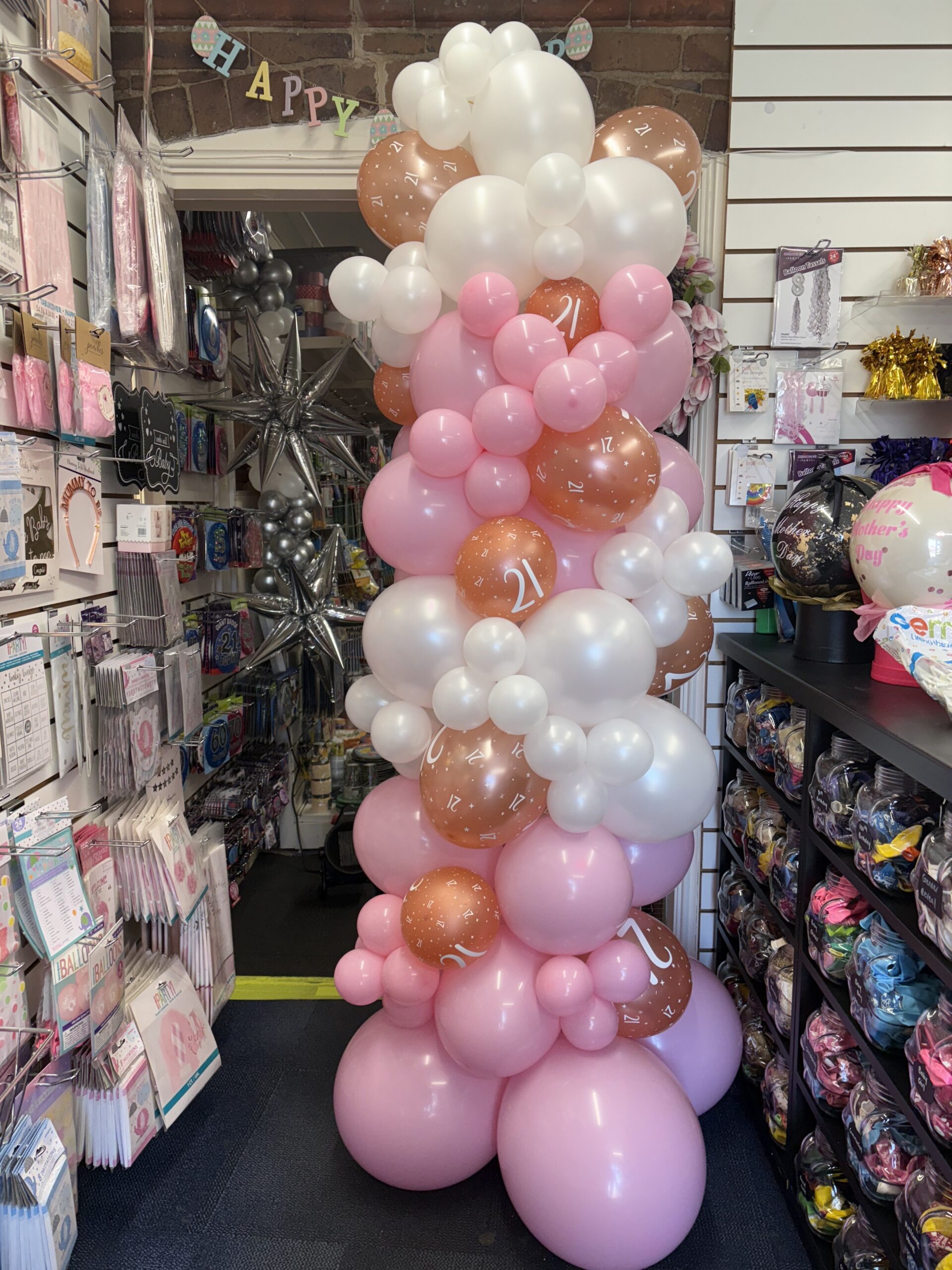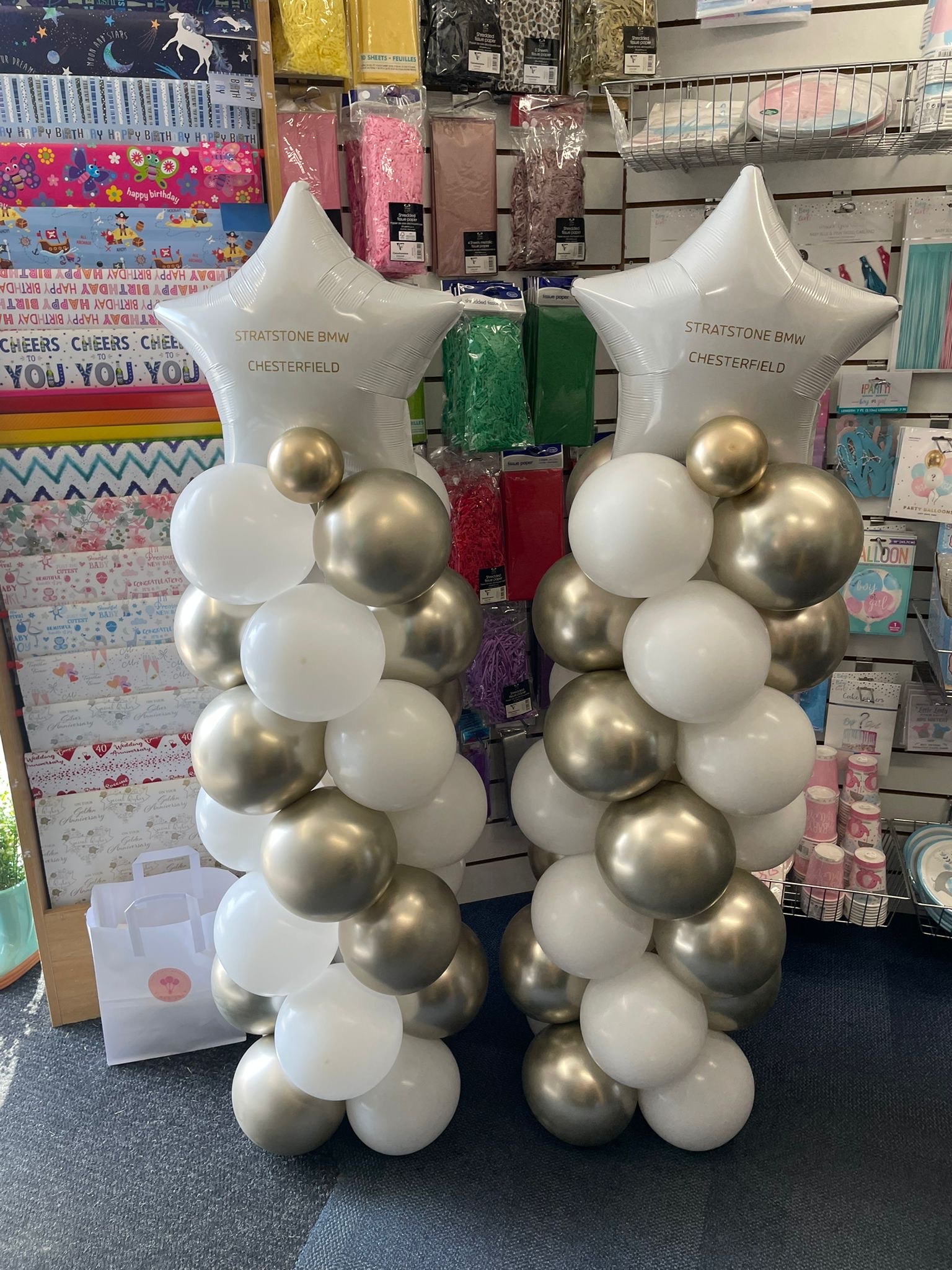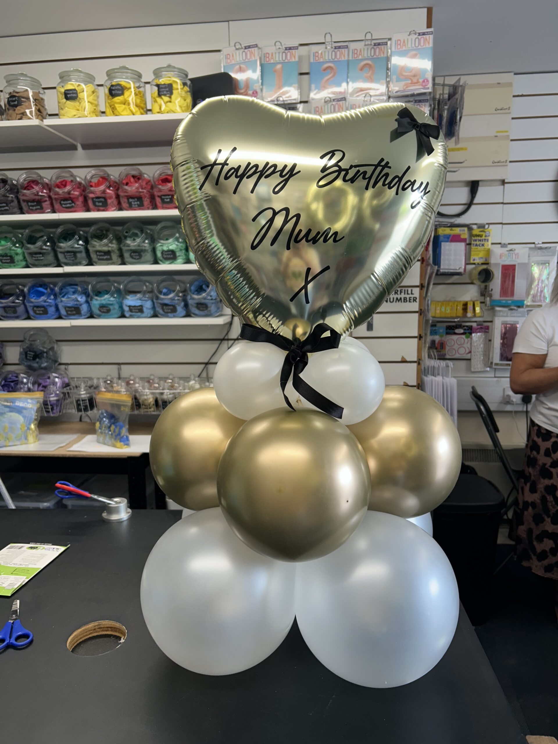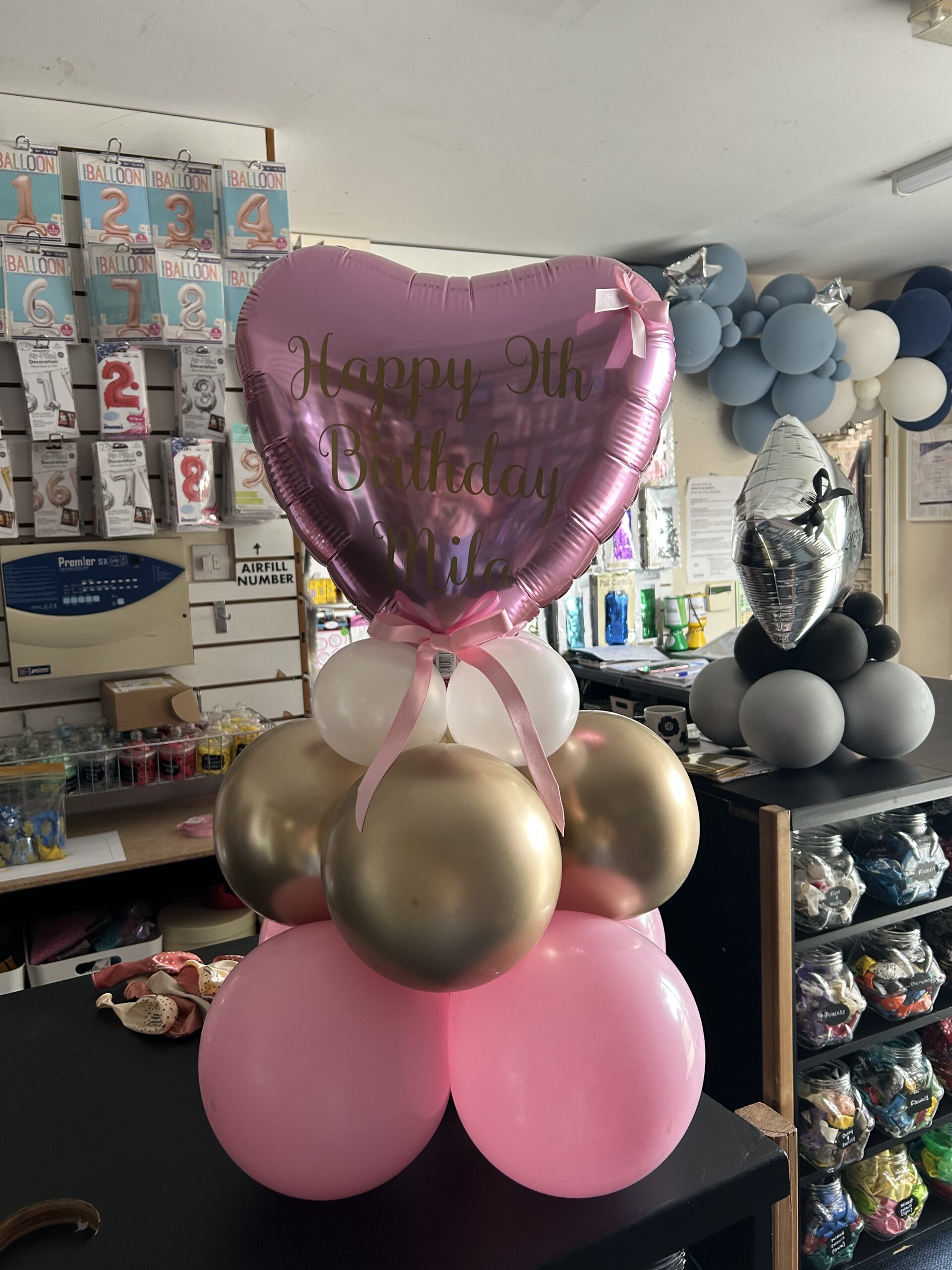Latex balloon stacks topped with your choice of a star, heart or circle foil balloons. Balloons can be in your choice of colours. Foil balloon can be personalised for an additional cost of £2.50. Price: £25.00.